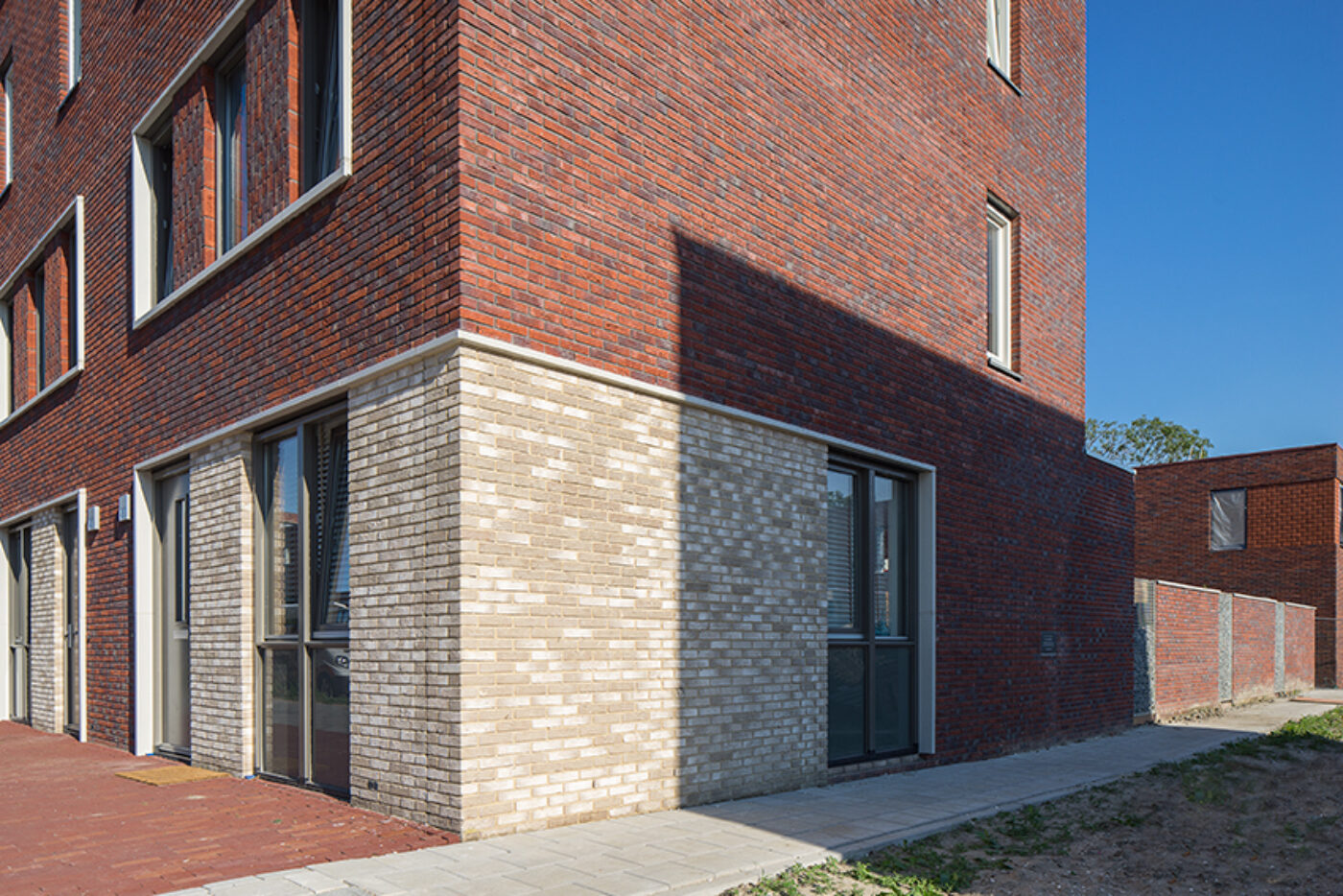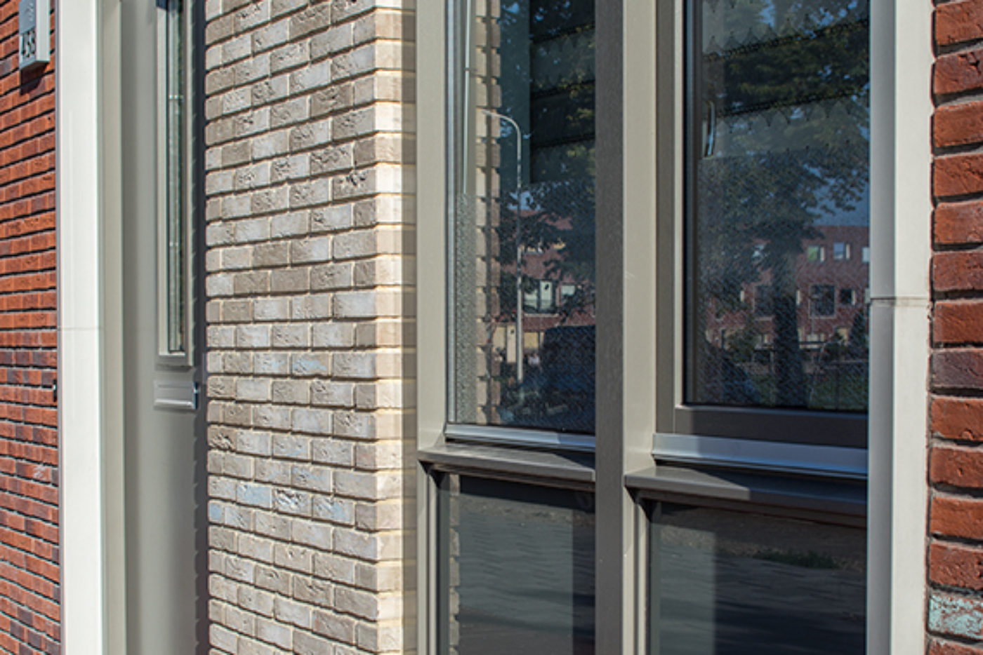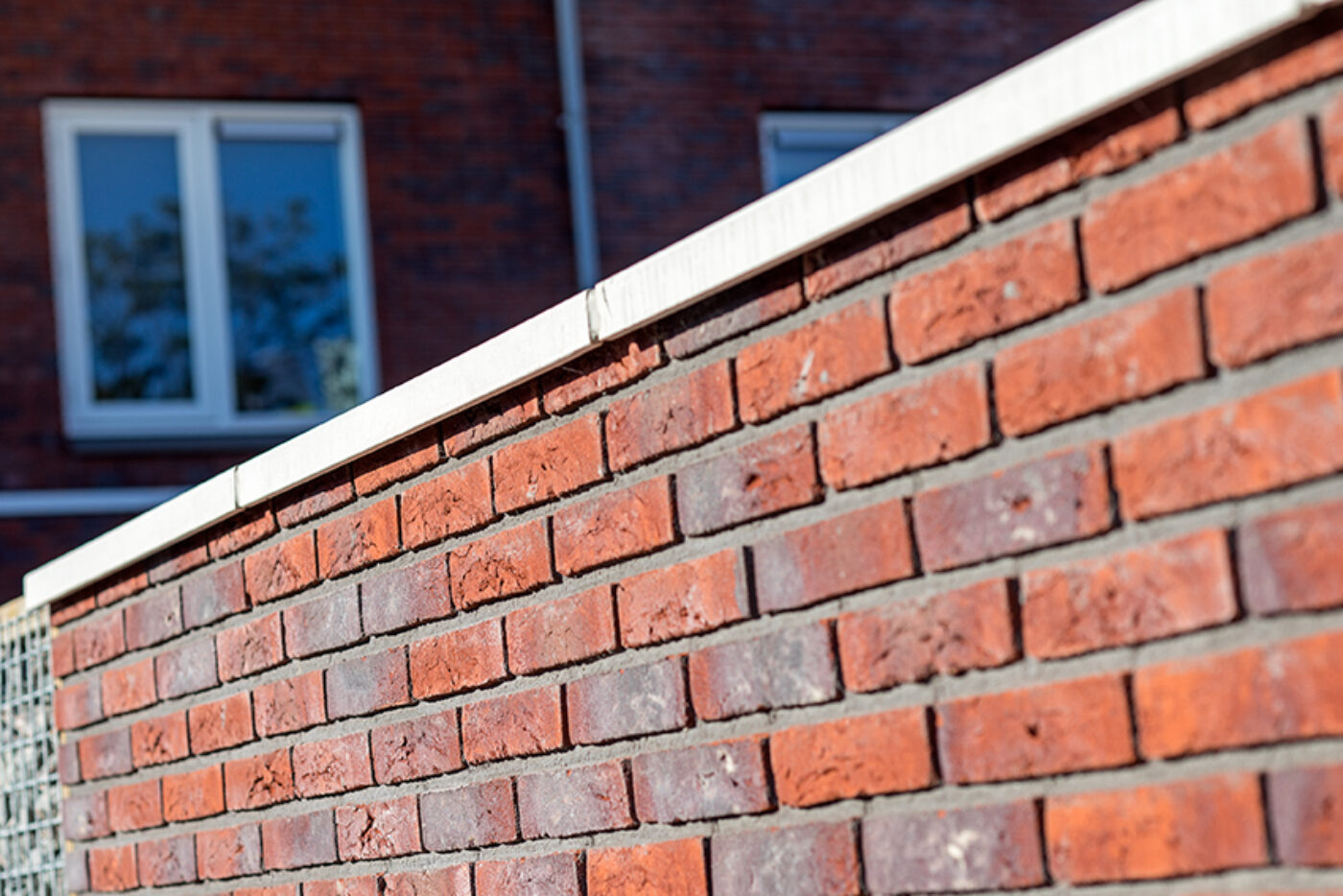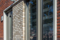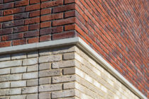 Holonite produzierte für das Projekt Lieverley weiße Laibungen, Mauerabdeckungen und Gesimse. Diese weißen Elemente bilden einen schönen Kontrast zum bunten Mauerwerk.