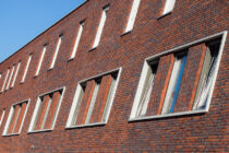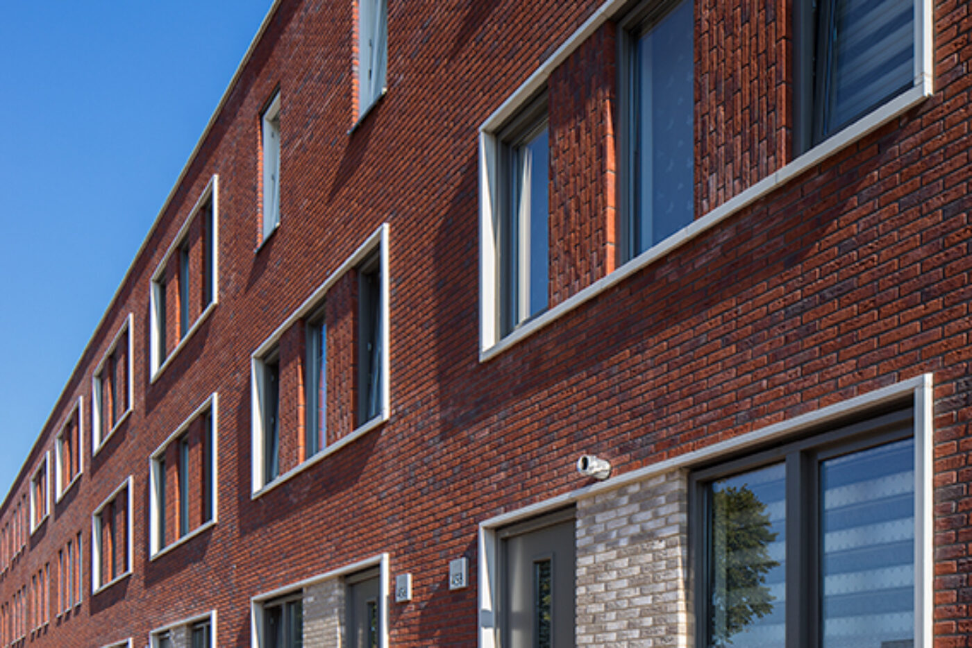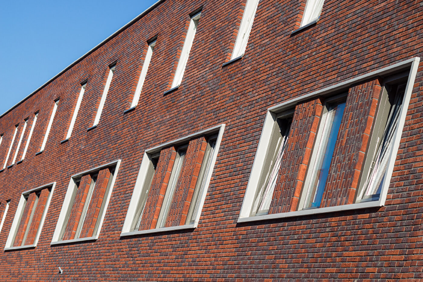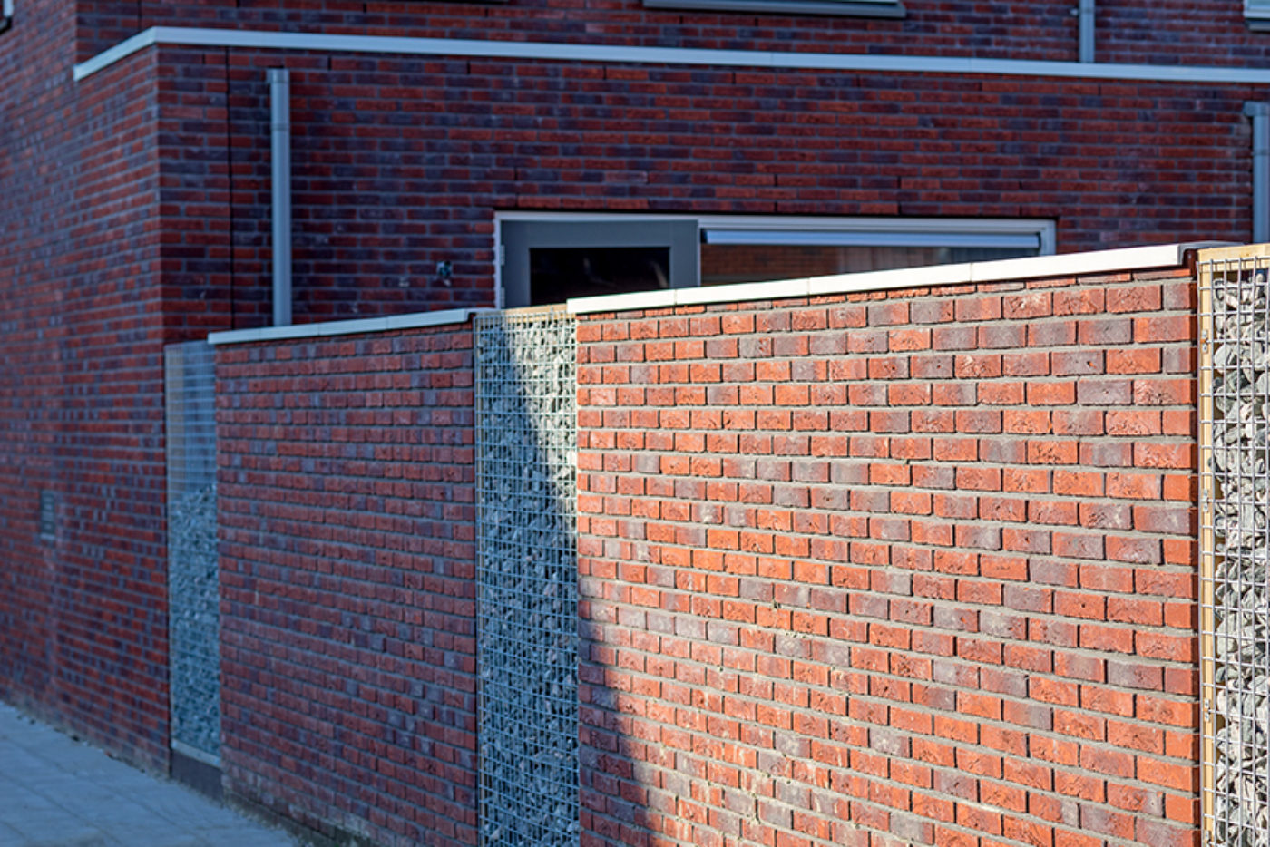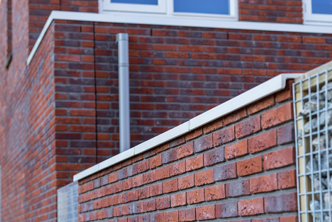 Holonite produzierte für das Projekt Lieverley weiße Laibungen, Mauerabdeckungen und Gesimse. Diese weißen Elemente bilden einen schönen Kontrast zum bunten Mauerwerk.